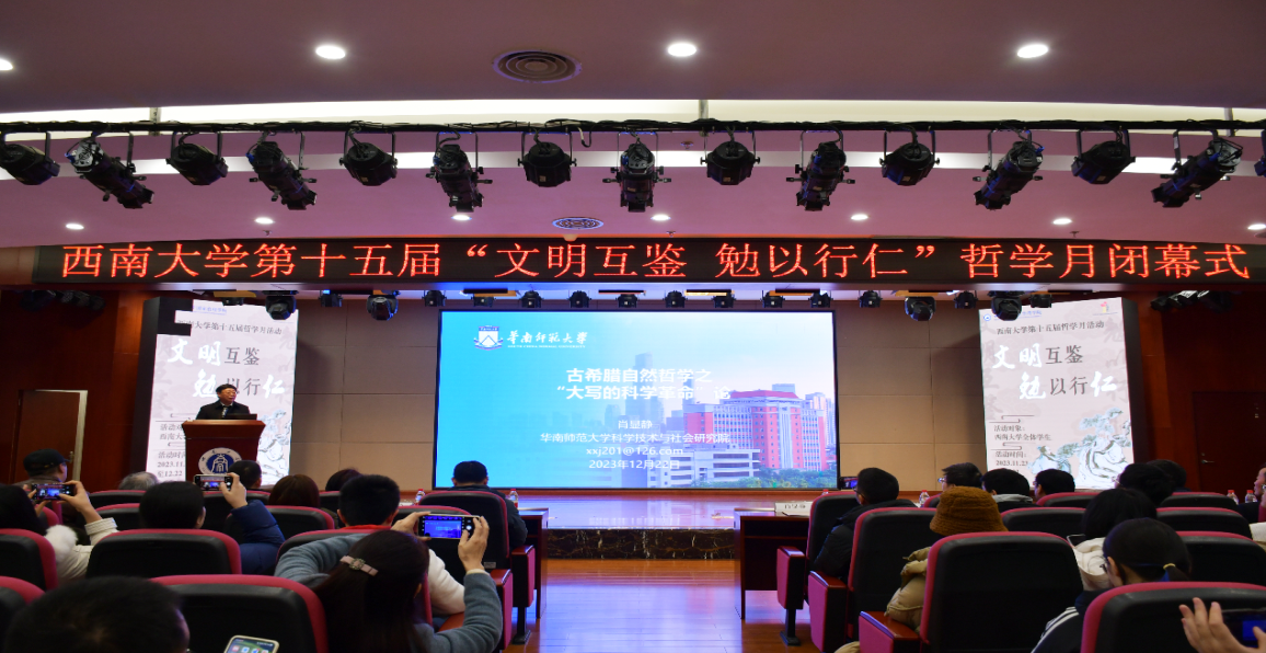闭幕式上,肖显静教授作了“古希腊自然哲学之‘大写的科学革命论’”的学术报告。报告以“古希腊自然哲学是否具有科学革命性”为引,由此指出,古希腊自然哲学以世界的本源学说解释世界的起源及其变化,是哲学优先于科学的,理性优先于经验的,思辨先在于实证的,是“哲学式科学”,相对于史前人类“神话式科学”,是一次“大写的科学革命”。这种革命具有自身的特色,不同于Lucio Russo的“精确科学”革命观,也不同于Schlagel的“经验的-理性的”科学革命观,而与科恩的古希腊自然哲学的“本原的-实在的”“抽象的-数学的”两种认识方式相合。
