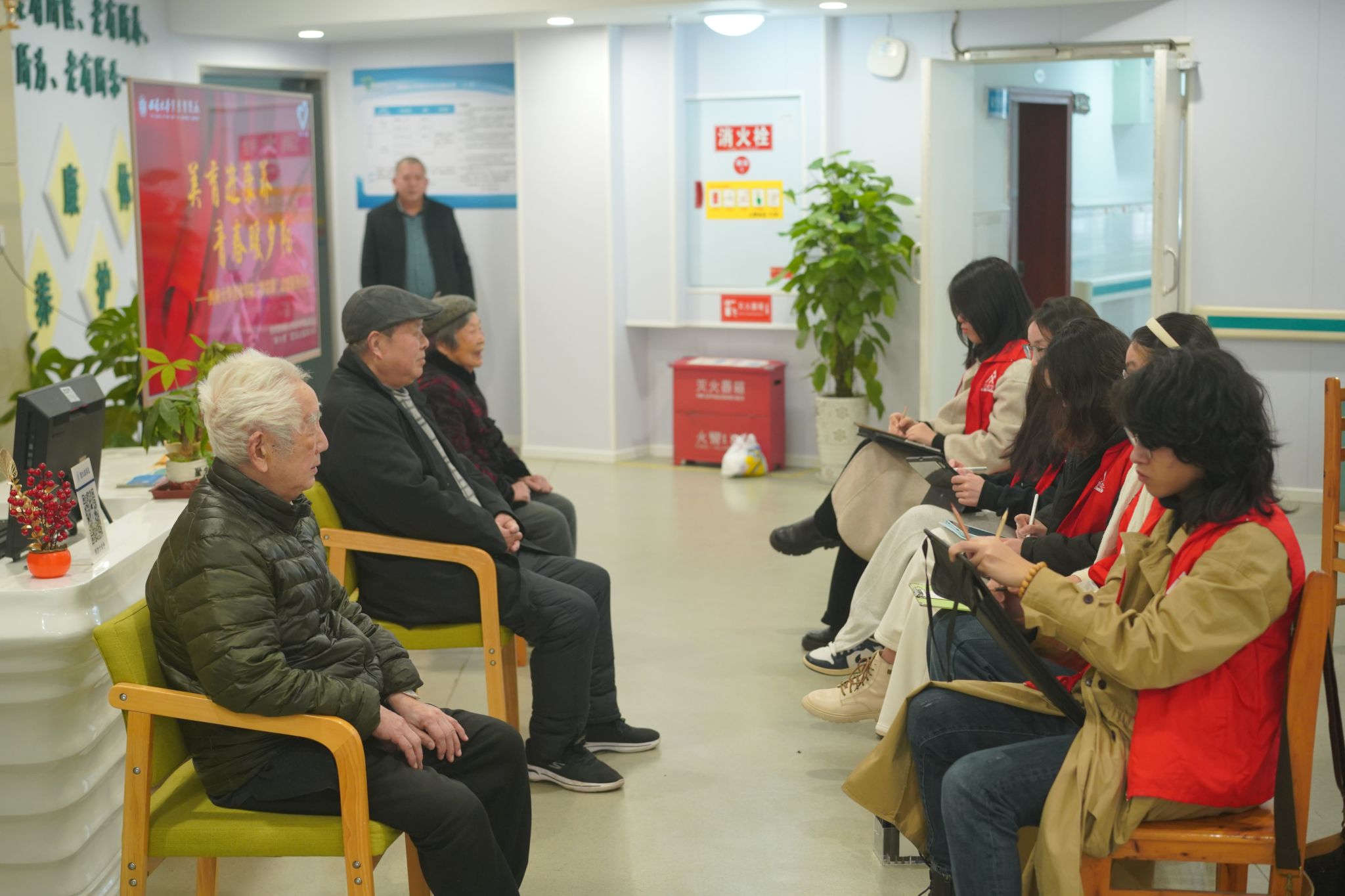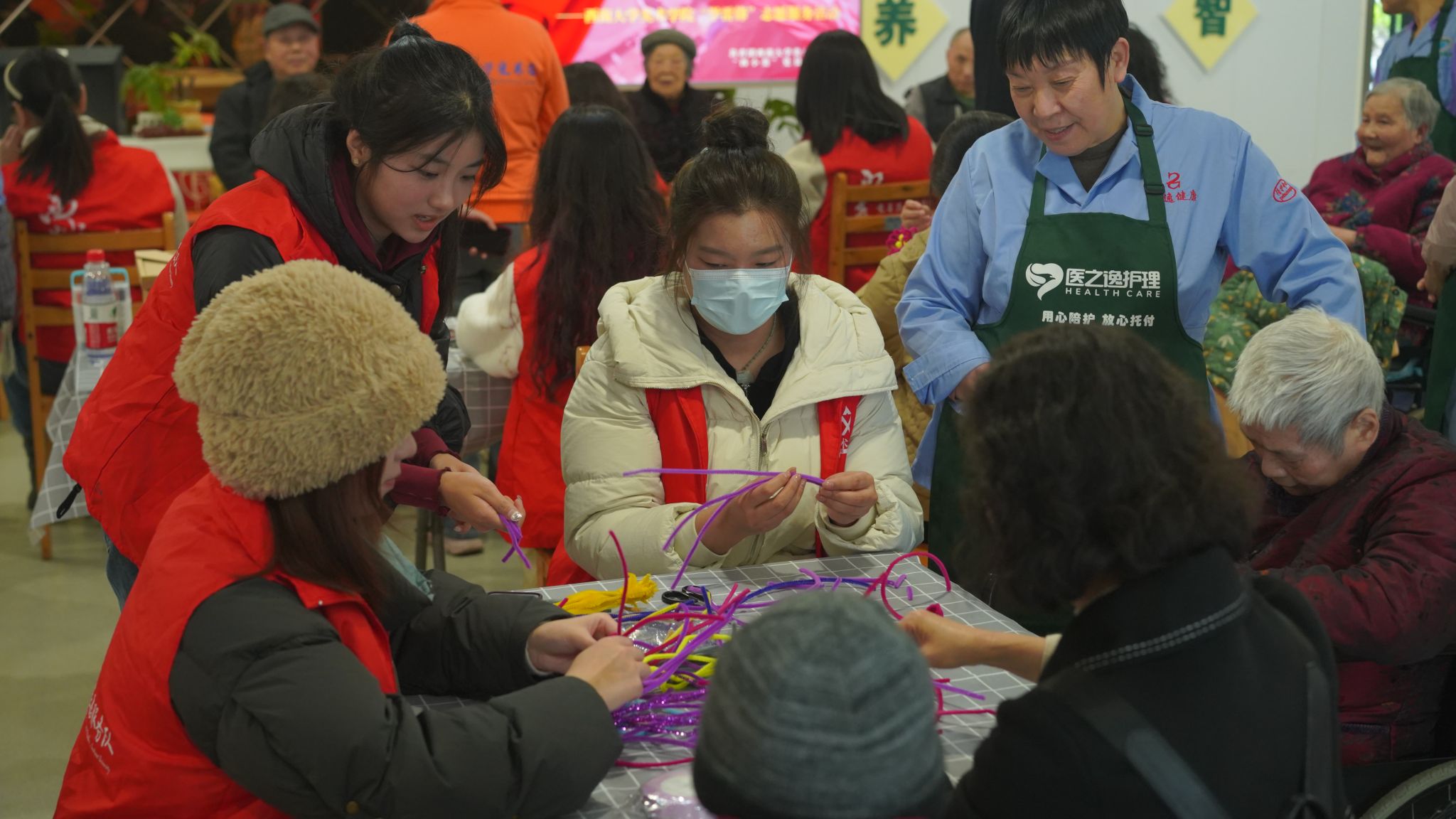 在画像活动区的另一侧,志愿者们借助色彩丰富的手工扭扭棒,带领养老服务中心的老人们一同制作。“朵朵绒线花,段段温暖情”,志愿者陪同老人制作、聊天,为老人“戴花”,养老服务中心内弥漫着温情的氛围。谈话间,老人们感悟和解读人生的意义,志愿者分享和点燃青春的活力,敬老爱老在活动中逐渐具象化,“螺丝钉”精神在服务中逐渐实际化。