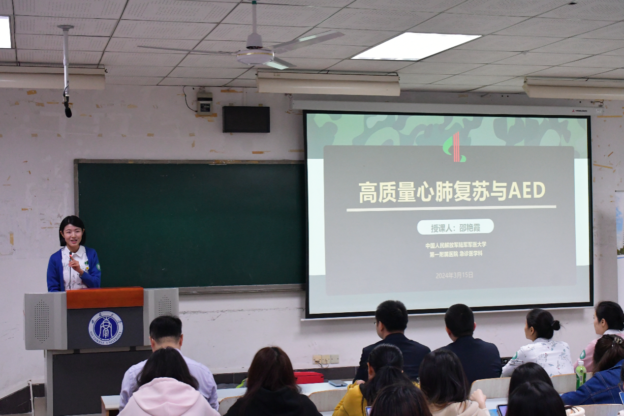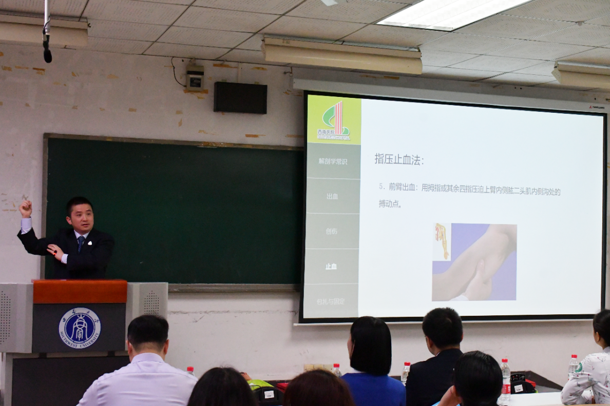 为巩固党史学习教育成果,弘扬红色军医精神,普及医疗急救知识,提高学生健康素养,指导师生就医急诊急救,3月15日国家治理学院与解放军陆军军医大学第一附属医院西南医院急救部联合开展“我为师生办实事”校园急救科普与就诊指导活动。西南医院急救部邵艳霞、陈小雄、张军等医护人员,学院全体辅导员、本科生共300余人一同参加,学院党委副书记李长松主持讲座。