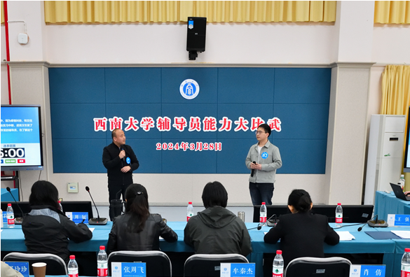 能力大比武分为理论测试、学情分析、案例研讨、谈心谈话四个环节。参赛辅导员围绕学生就业、寝室矛盾等具体案例开展研讨分析,针对学生学业发展、人际交往等主题进行谈心谈话,在实战演练中提升自身的理论素养和业务能力。资源环境学院牟秦杰获得3月份辅导员能力大比武“能力达人”称号。