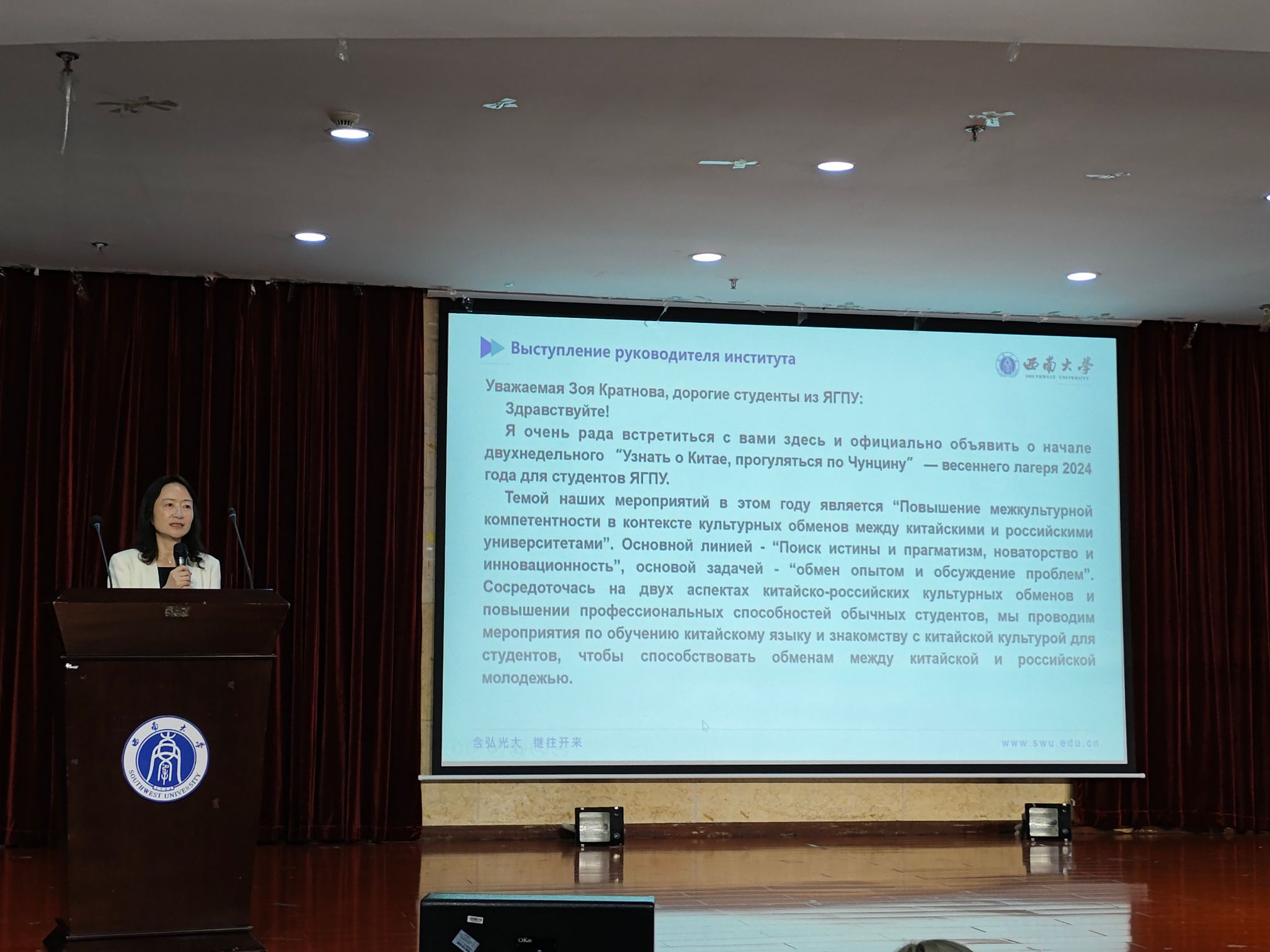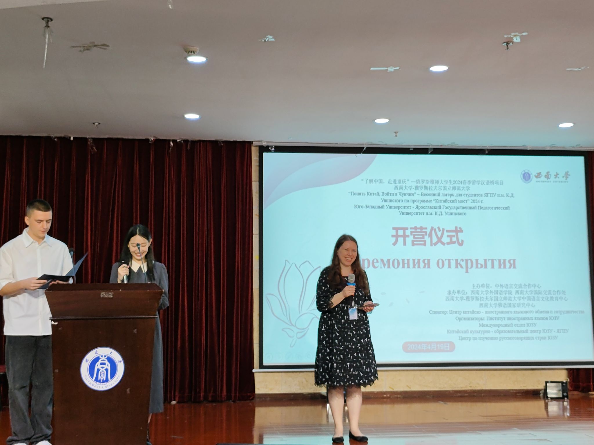 4月19日上午9时,由教育部中外语言交流合作中心主办,俄罗斯雅罗斯拉夫尔国立师范大学(以下简称“雅师大”)大学生参加的“了解中国、走进重庆”2024年“汉语桥”项目外国学生春令营活动在beat365英国官网外国语学院101报告厅拉开序幕。beat365英国官网国际合作与交流处代远鸿副处长,外国语学院党委书记徐天虹、副书记纪委书记李晓畅、俄语系主任谢周教授、俄语系外教叶莲娜·鲍尔德列娃教授、奥尔加·卡兹敏娜副教授以及俄方带队老师卓雅·克拉特诺娃、全体营员等出席了本次开营仪式。