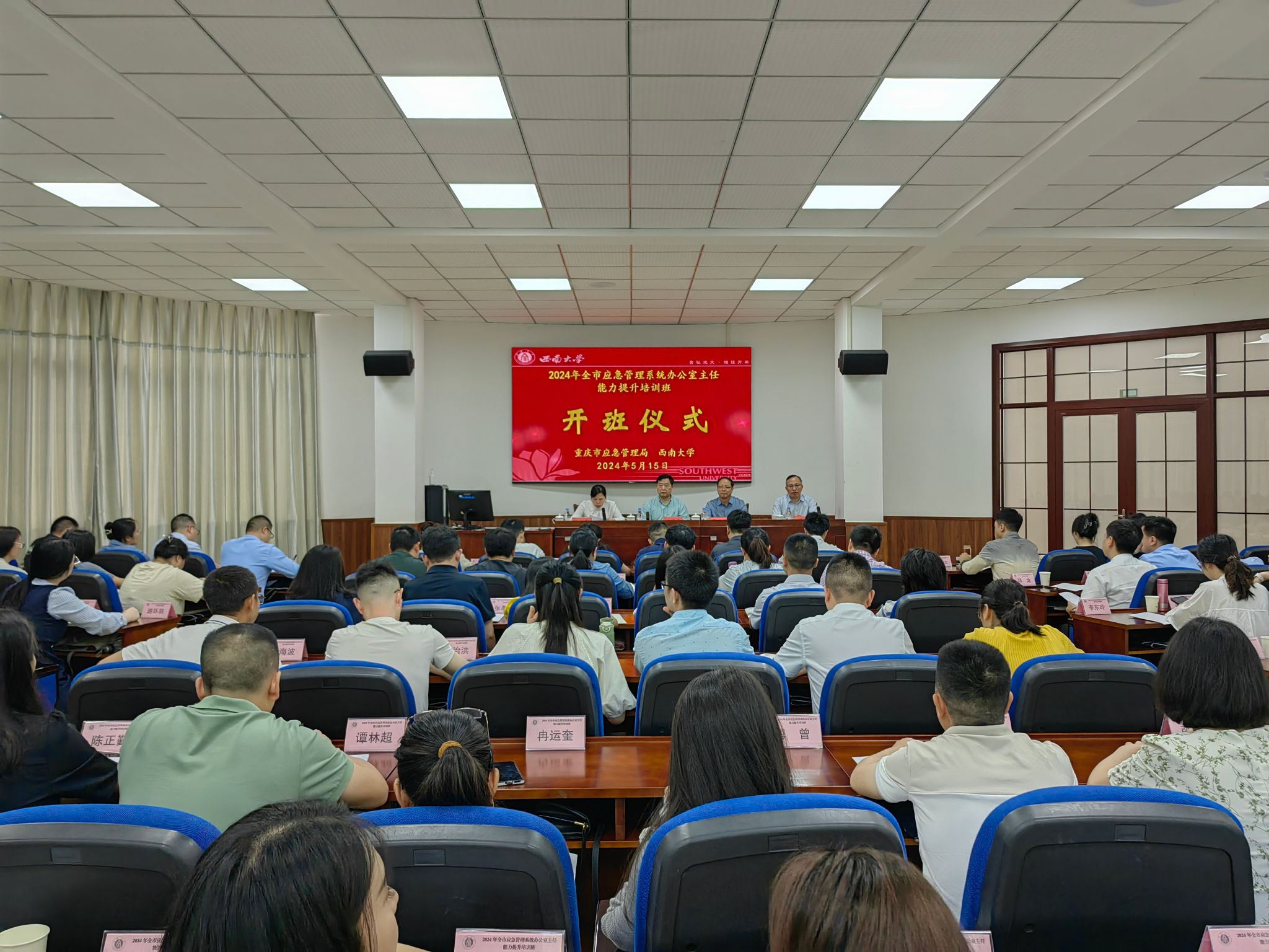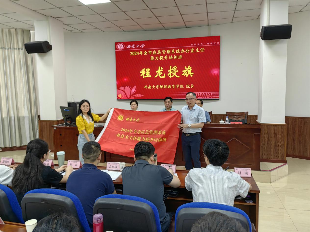 5月15日上午,全市应急管理系统办公室主任能力提升培训班在学校顺利开班。重庆市应急管理局一级巡视员何建平、学校副校长周光明出席开班式并讲话,继续教育学院院长程龙向培训班授班旗,市应急管理局办公室主任陈进联主持开班式。