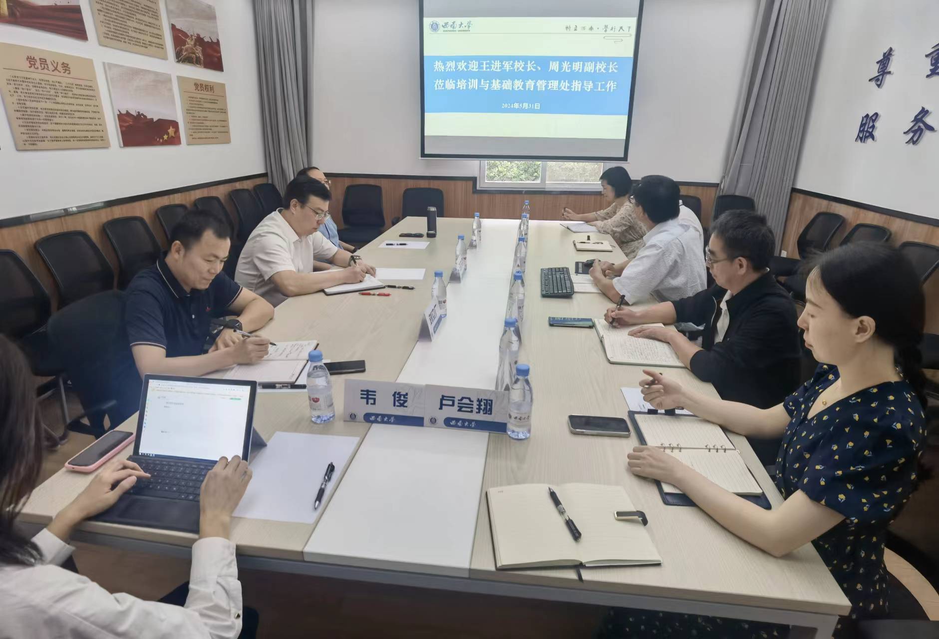 王进军认真听取了工作汇报,并同与会人员进行了亲切交流,对培训与基础教育管理处开展的各项工作所取得的成效给予充分肯定。他谈到,培训与基础教育管理处作为学校成立不久的职能部门,为学校提升社会服务整体效能作出了应有贡献,工作卓有成效。下一步,学校将在充分调研基础上,打破桎梏、释放活力,优战略、重内涵、求创新、抓改革、强治理,优化机构、职责,进一步为高质量发展“蓄势赋能”。希望培训与基础教育管理处加强学习和调研,明晰职责边界,做好学校基础教育合作办学与非学历教育工作的“防火墙”, 强党建、聚合力、谋新局、促发展,为学校服务国家战略和经济社会发展提供有力支撑。