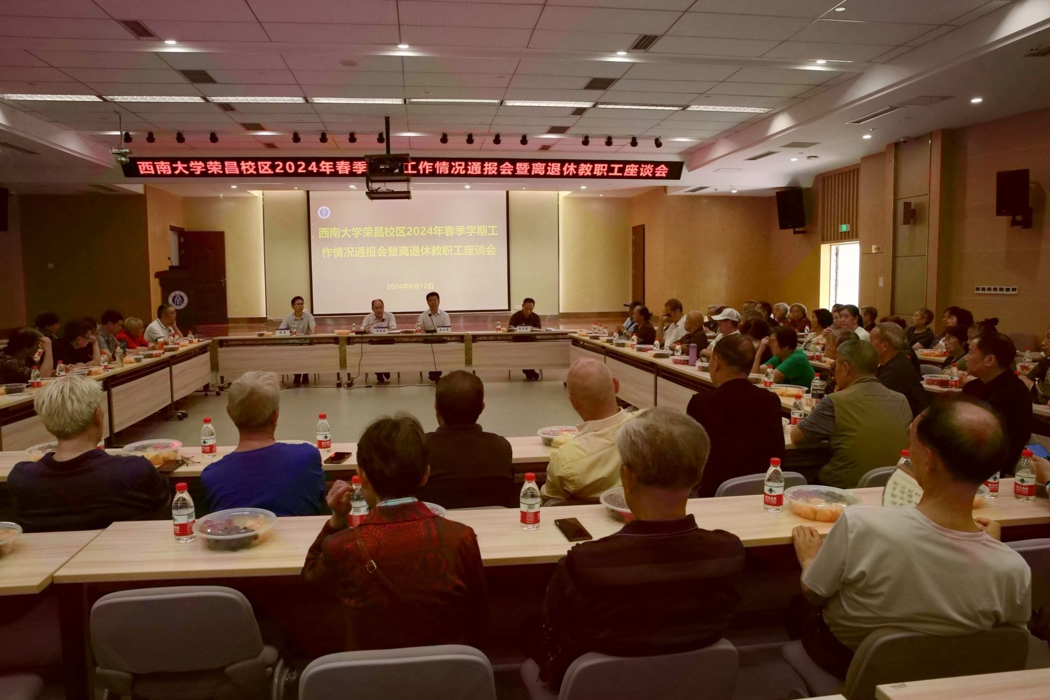 6月12日,beat365英国官网荣昌校区2024年春季学期工作情况通报会暨离退休教职工座谈会在7B101报告厅举行,校区管委会主任赵永聚主持会议,校区党工委书记周国安通报工作情况。校区党工委副书记、纪工委书记穆奎,副处级组织员包尔泉出席会议,离退休工作办公室全体工作人员及70余名离退休教职工参加会议。