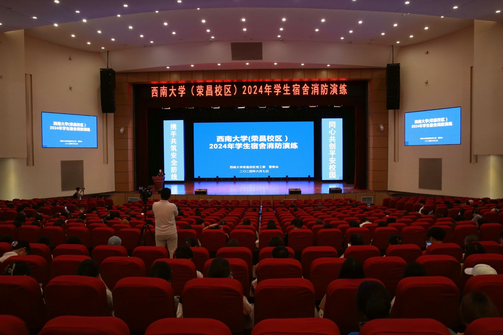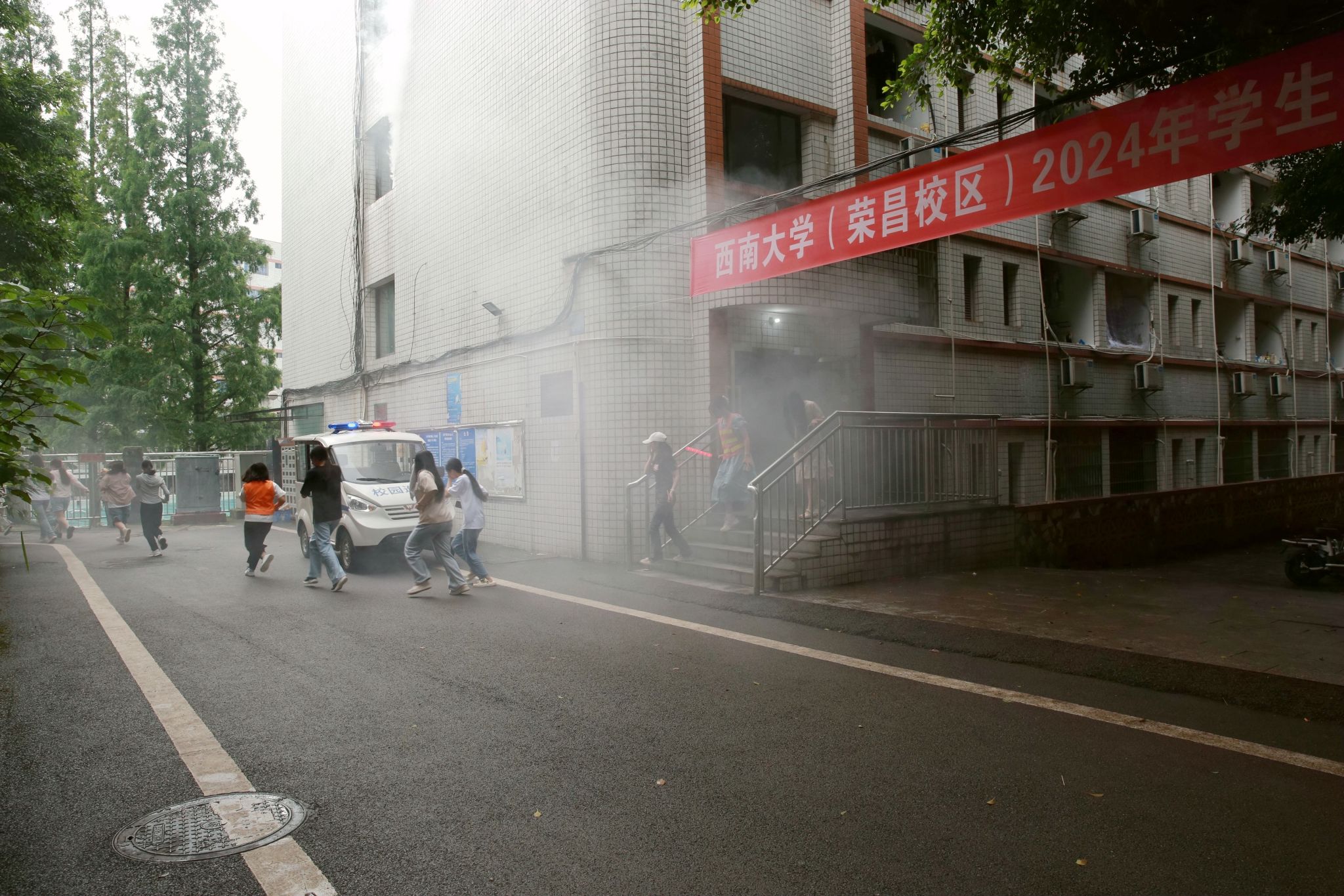 为贯彻落实《教育部办公厅 国家消防救援局办公室关于联合开展学校火灾疏散逃生大演练活动的通知》(教发厅函 〔2024〕6号)文件要求,切实提升师生消防安全意识和自防自救能力,增强火灾应对和火场逃生能力,6月7日下午,荣昌校区党工委、管委会在学生宿舍6舍组织开展了学生宿舍火灾疏散逃生演练活动。校区党工委周国安书记,党工委副书记、纪工委书记穆奎、荣昌区消防救援支队灭火救援科殷席豪科长及校区学工办、后勤集团荣昌校区服务中心、在荣学院领导、辅导员、学生代表200余人全程观摩了此次演练活动;学生宿舍6舍楼栋志愿消防队及400余名学生、宿舍值班人员、保卫办应急处突队员、医务人员参加演练。