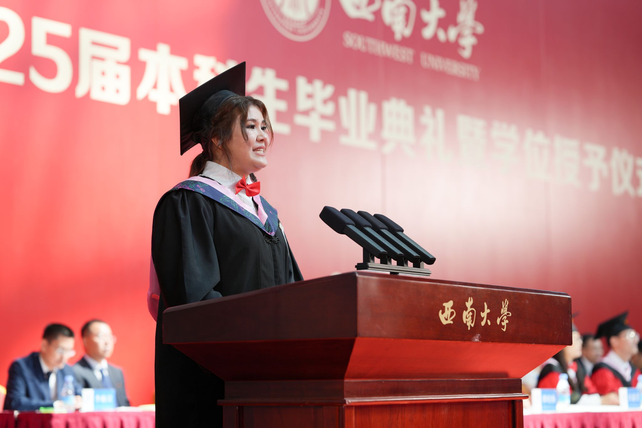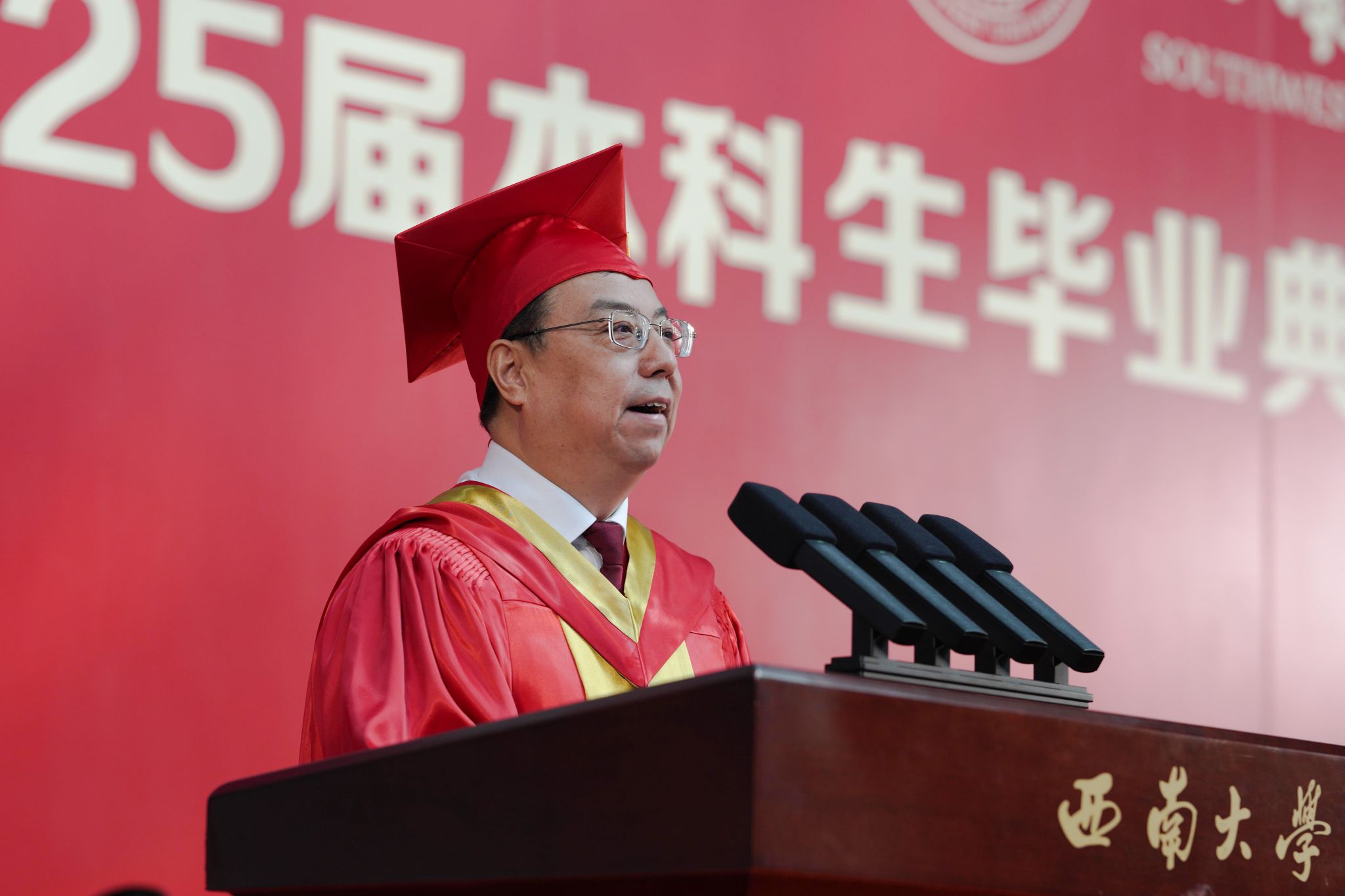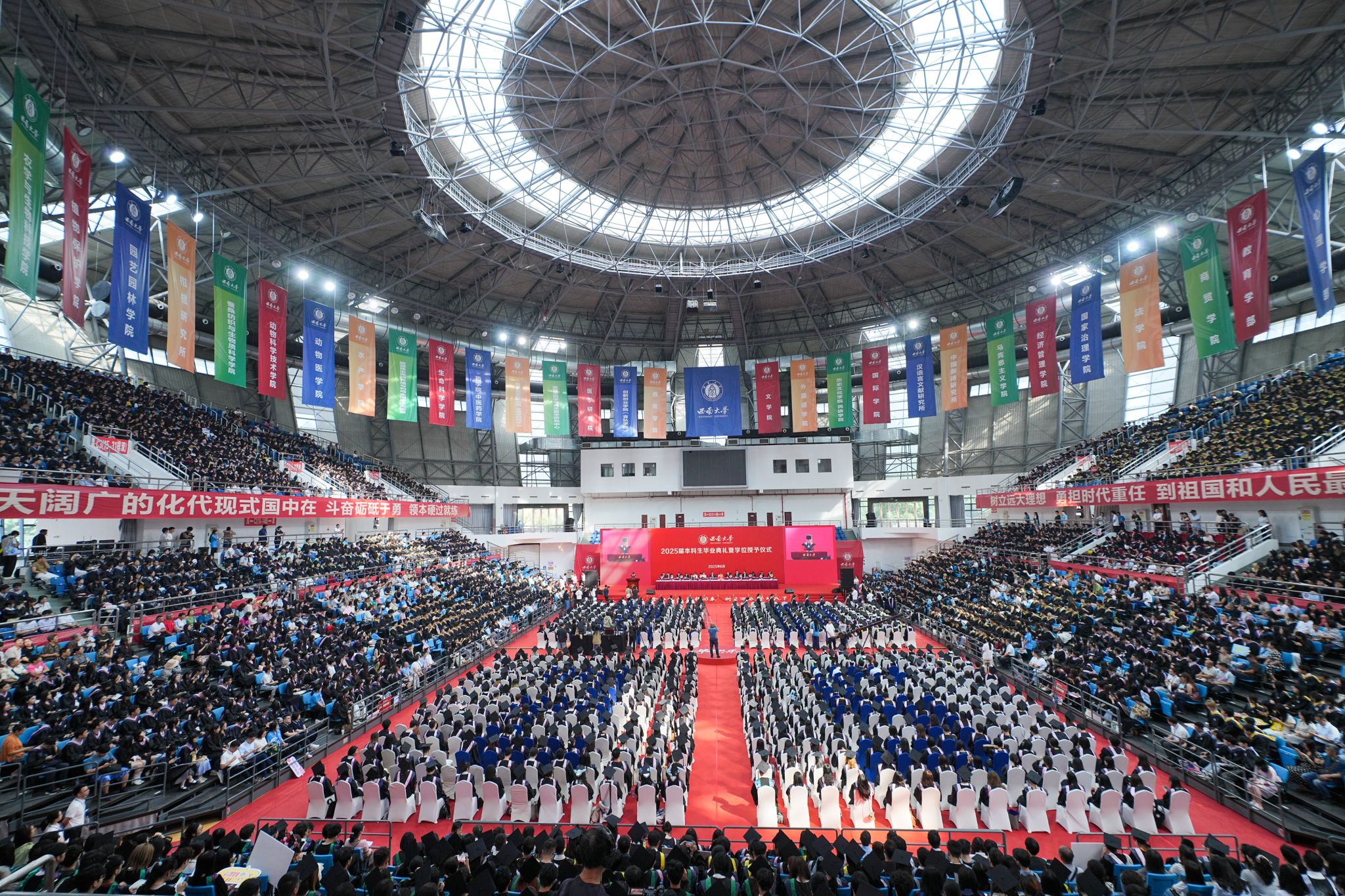 6月26日上午,学校在北碚校区中心体育馆和荣昌校区学生活动中心同步举行2025届本科生毕业典礼暨学位授予仪式,庆祝9434名本科毕业生圆满结束大学生活,开启人生新篇章。
