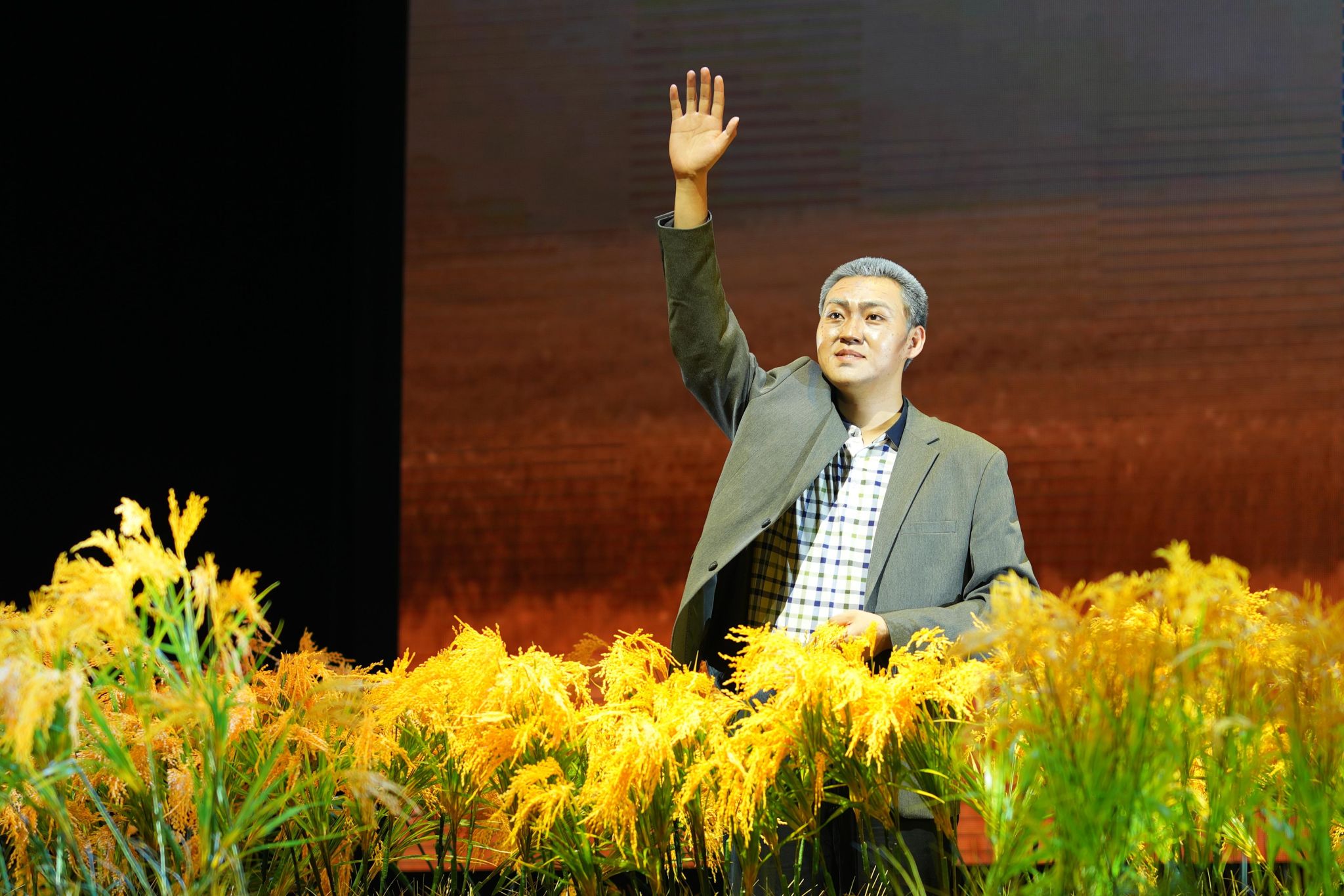 话剧以晚年袁隆平讲述为叙事框架,通过倒叙手法用11幕剧情串联其一生的重要瞬间:“土地会告诉你答案”一幕讲述了青年袁隆平在西南农学院受恩师管相桓启发,突破“水稻无杂种优势”的学术桎梏,奠定杂交水稻研究信念的故事;“到祖国需要的地方去”一幕再现了袁隆平与同学吴明珠等,为祖国的科研事业在祖国各地耕耘奉献,用各自的奋斗彰显科技报国理想的场景;“一家人永远不分开”一幕叙述了遭遇秧苗被毁后,袁隆平与学生奋力保存三钵不育株的历程……一帧帧生动画面描绘刻画了袁隆平勇于追求真理、敢于创新,富有时代责任感,又不乏生活情趣的鲜活形象,一幕幕精彩瞬间更是让现场观众颇为感动震撼。