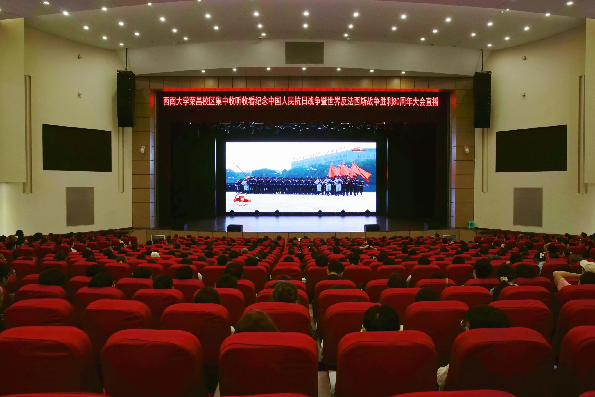 学校还在北碚校区圆顶报告厅、荣昌校区大礼堂等场馆设立会场,组织师生集中收听收看大会直播。各二级单位结合实际采取集中与分散相结合的方式组织师生共观盛会。师生们备受鼓舞,倍感振奋。大家纷纷表示,将深入学习贯彻习近平总书记在大会上的重要讲话精神,不断在伟大抗战精神中汲取奋进力量,踔厉奋发、勇毅前行,以更加昂扬的斗志、更加坚定的信念、更加顽强的拼搏,为以中国式现代化全面推进强国建设、民族复兴伟业贡献新的更大力量!