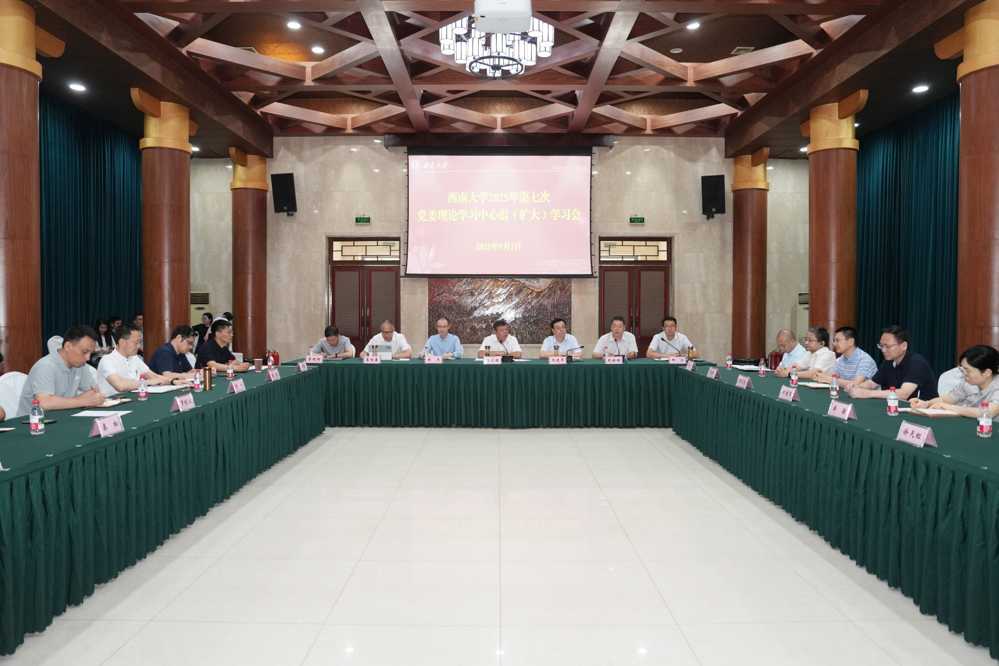 上午9时,学校召开2025年第七次党委理论学习中心组(扩大)学习会议,组织全体在校校领导、党委常委、党委委员集中收看大会并开展交流研讨。会议强调,要深入学习贯彻习近平总书记在大会上的重要讲话精神,传承和弘扬伟大抗战精神,推动学校事业高质量发展。会议指出,要铭记历史、赓续血脉,在真学真思真信中筑牢政治忠诚;要以史为鉴、开创未来,在正确历史观中强化使命担当;要锚定目标、实干争先,奋力书写学校高质量发展的时代答卷,在教育强国建设中谱写崭新篇章。